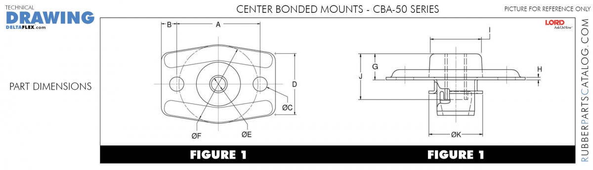 LORD CBA-50 Series center bonded mounts allows design freedom for mating bracket. Bracket thickness is controlled by required strength and clearance holes can be punched, drilled or cast. The bolt which assembles the supported member to the mount can be tightened to normal torque. Proper precompression of the flexing element takes place when the bolt is tightened against the mounts inner member.